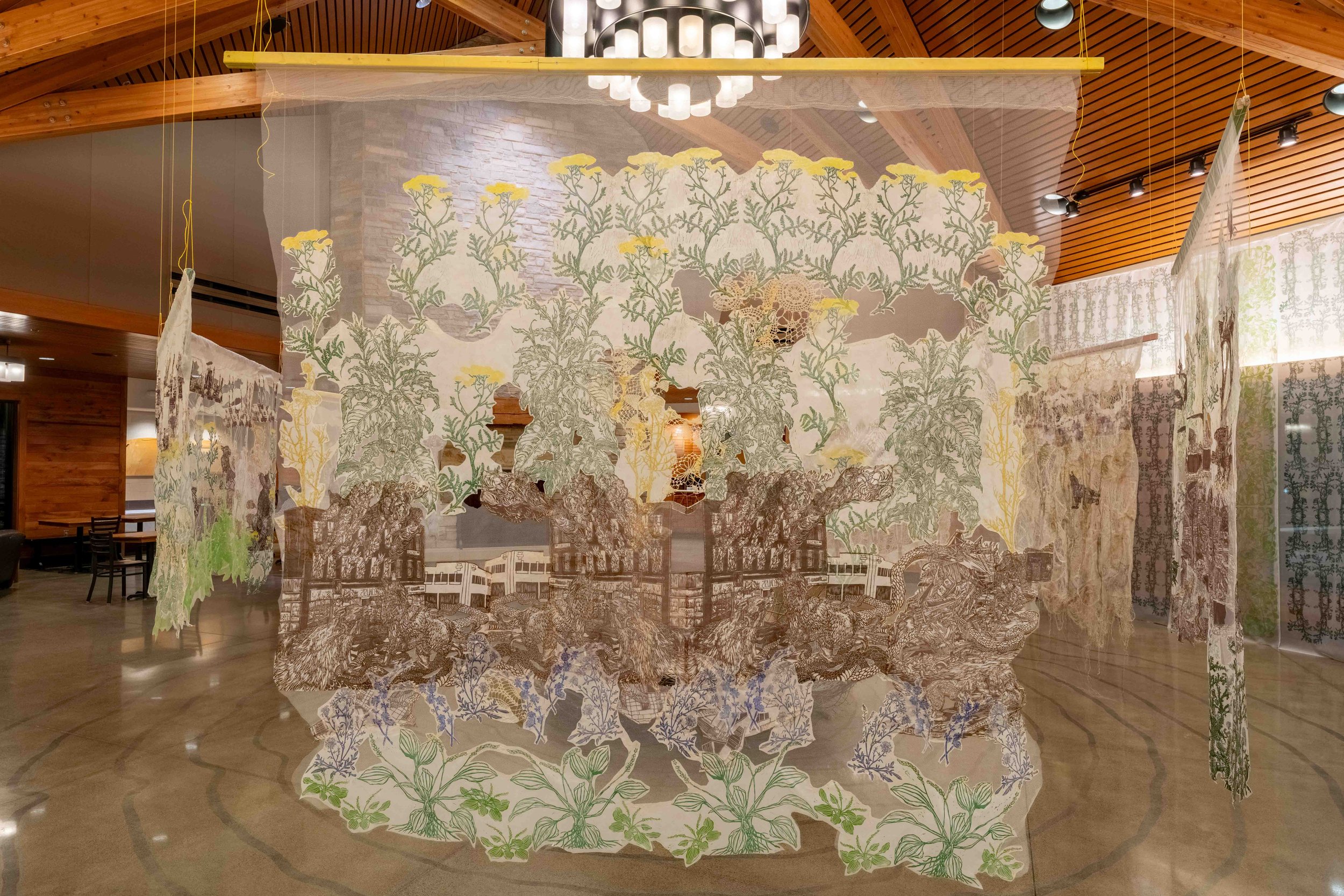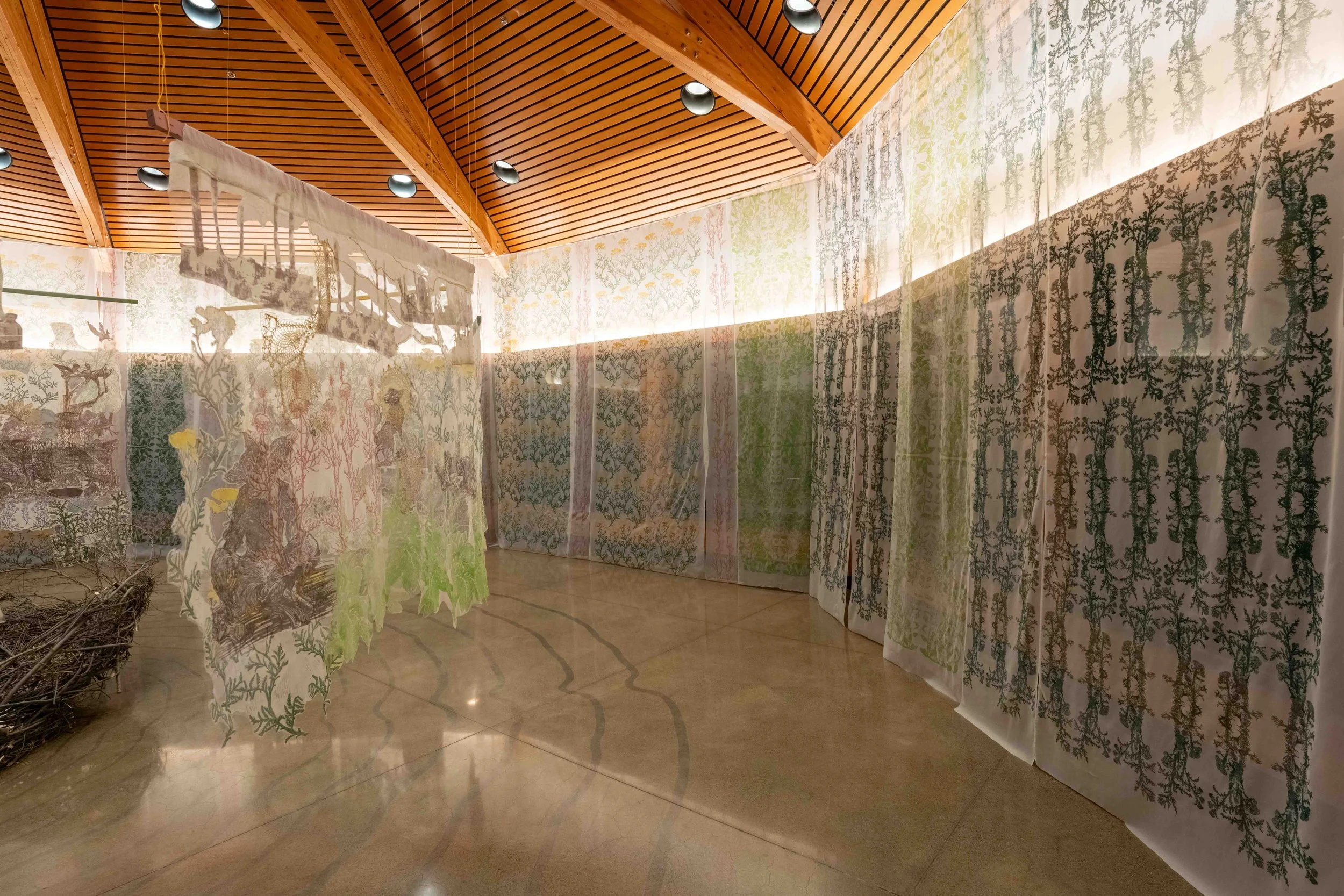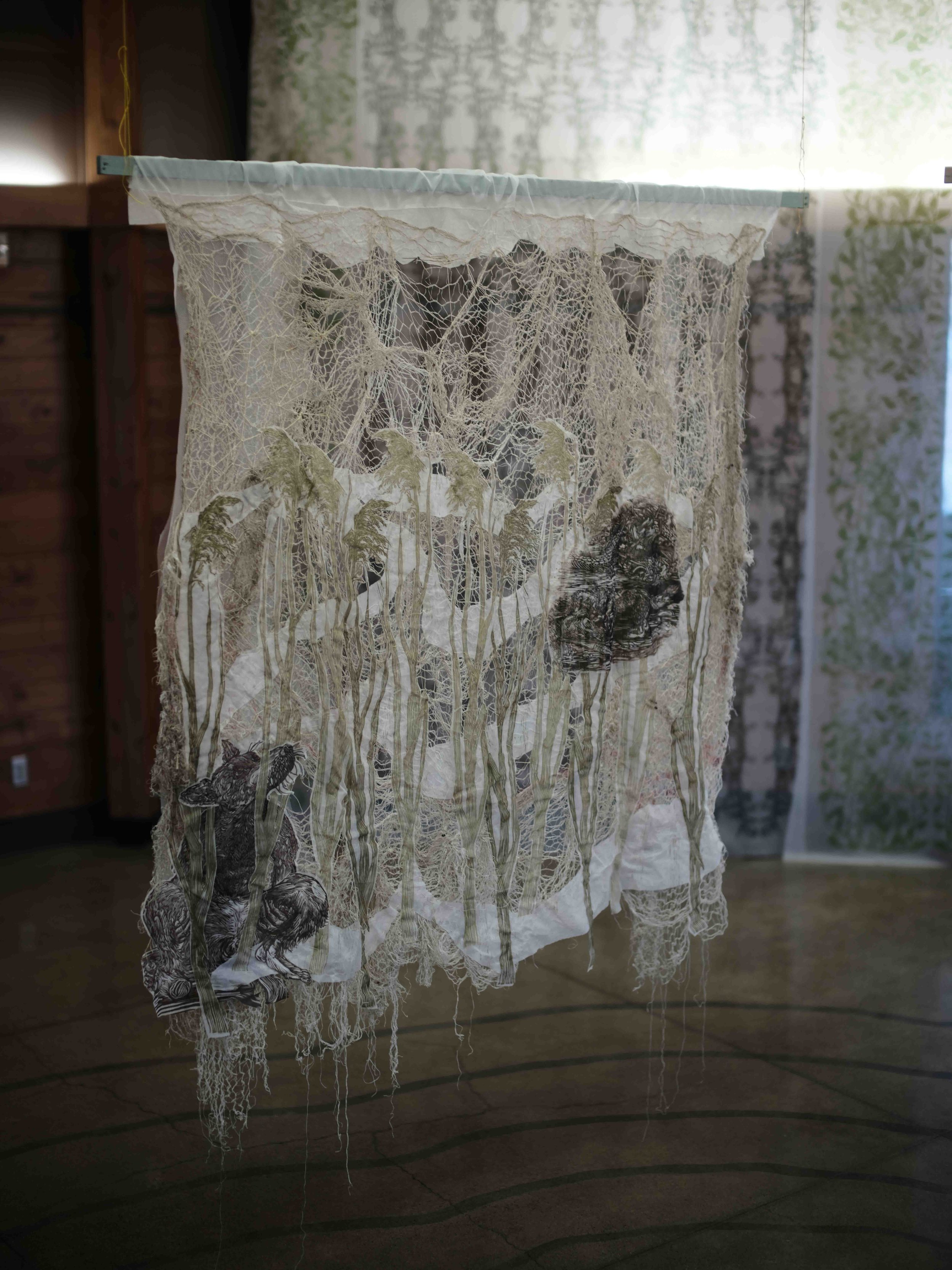How Will You Know When You Belong transforms the Silverwood Park Gallery into a lush installation of sculptural tapestries featuring botanical and industrial prints mended together with rich, unusual embroidery. Translucent, two-sided and full of openings, this immersive work invites viewers to locate themselves a bound-up-with shifting patterns in ecosystems and changing seasons. It asks: The land is changing: how are we going to change along with it?