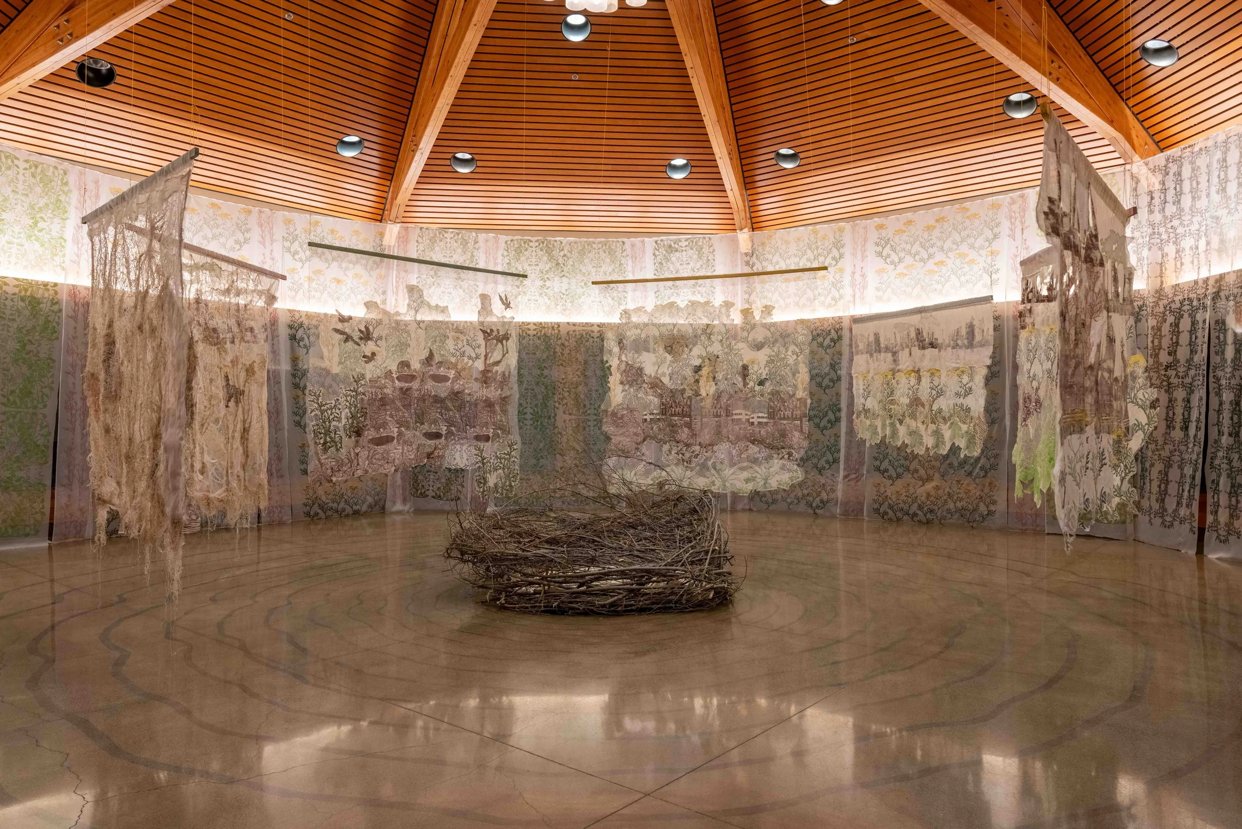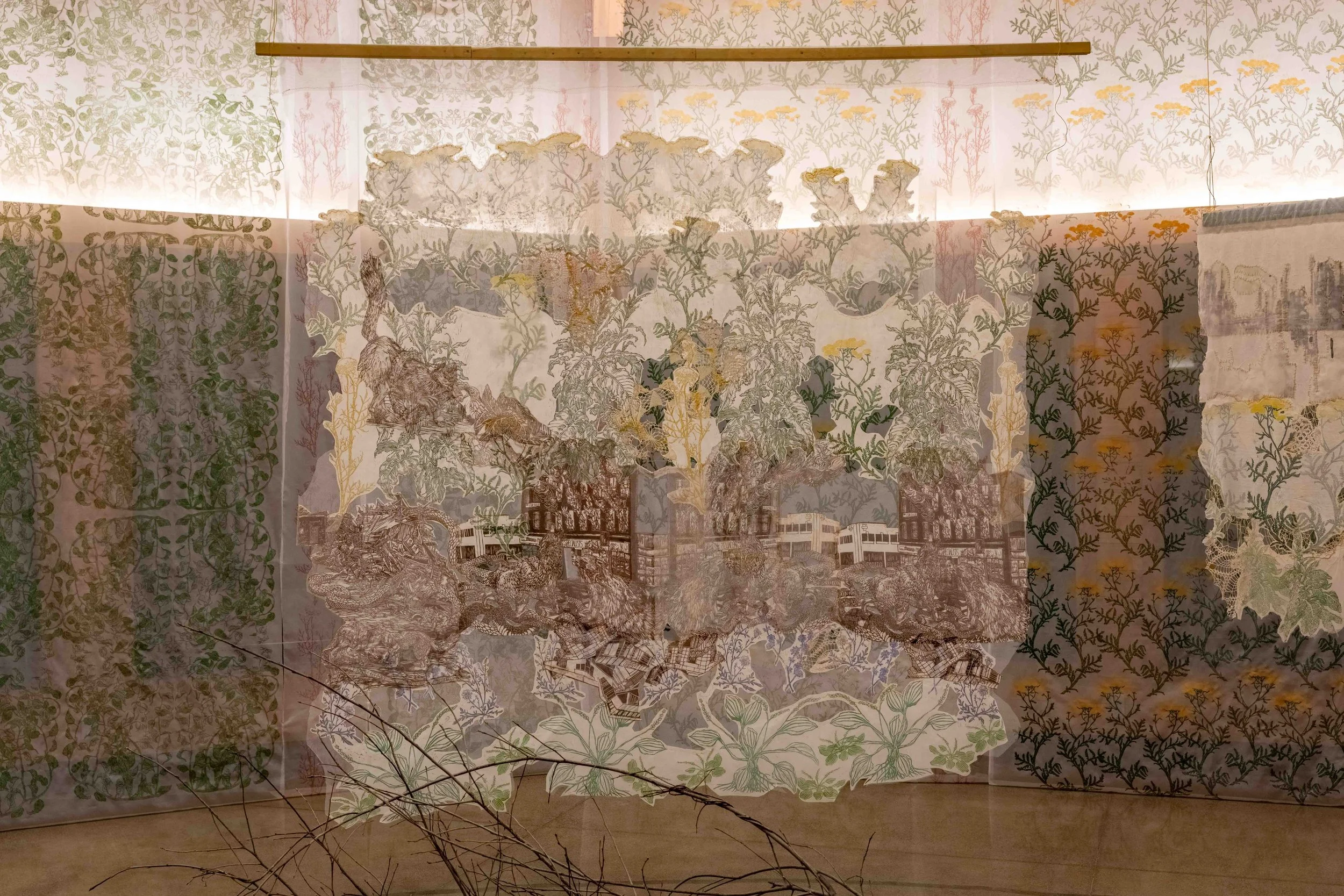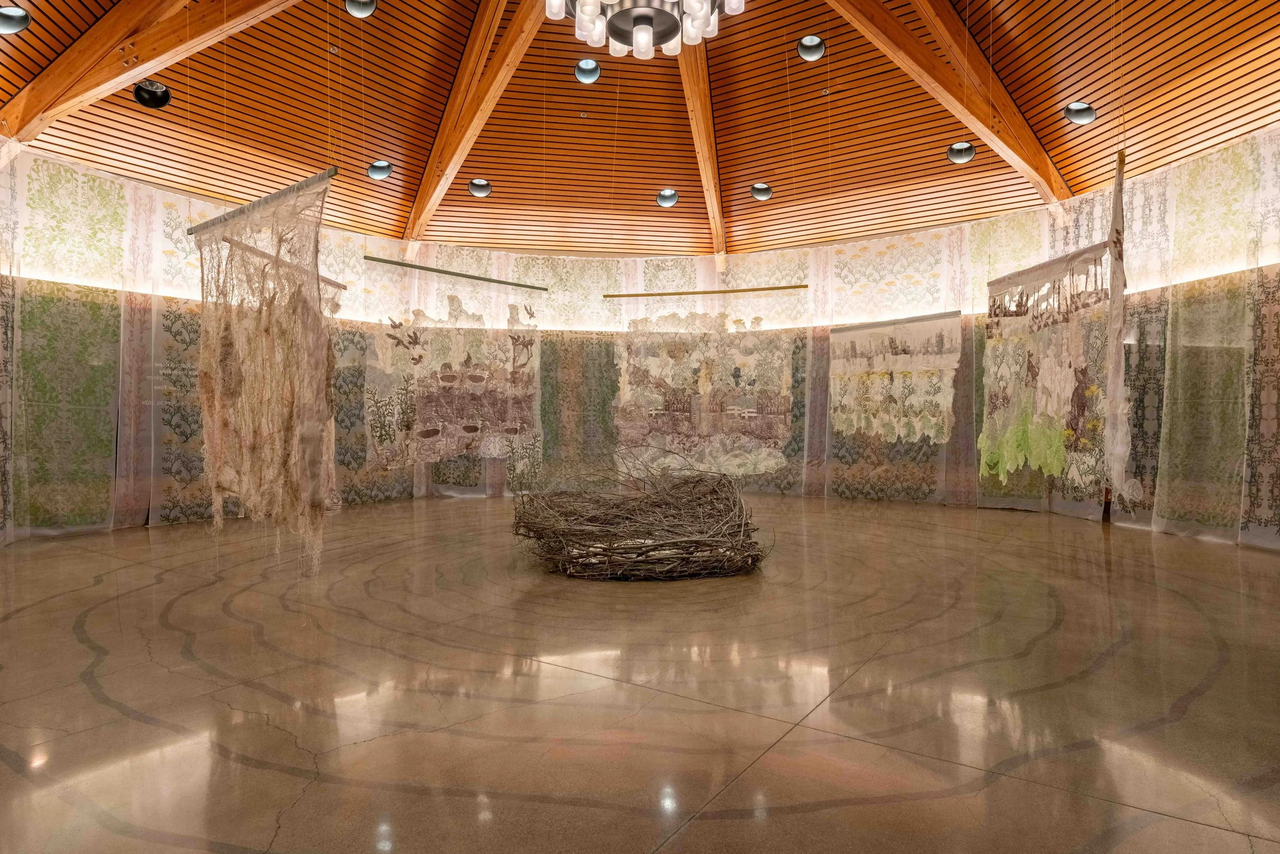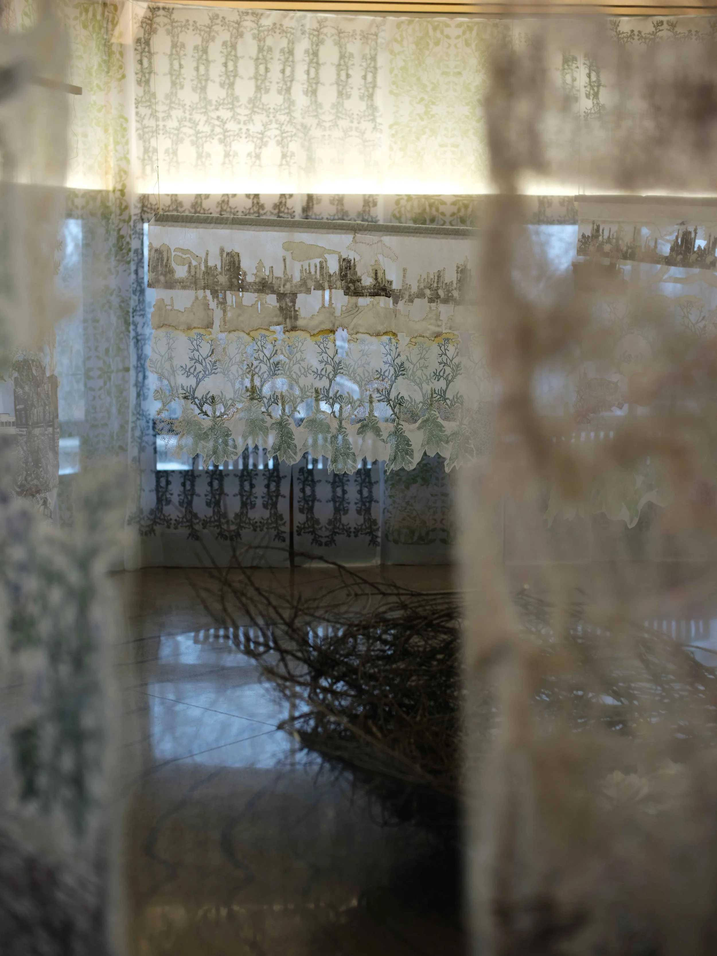 How Will You Know When You Belong transforms the Silverwood Park Gallery into a lush installation of sculptural tapestries featuring botanical and industrial prints mended together with rich, unusual embroidery. Translucent, two-sided and full of openings, this immersive work invites viewers to locate themselves a bound-up-with shifting patterns in ecosystems and changing seasons. It asks: The land is changing: how are we going to change along with it?