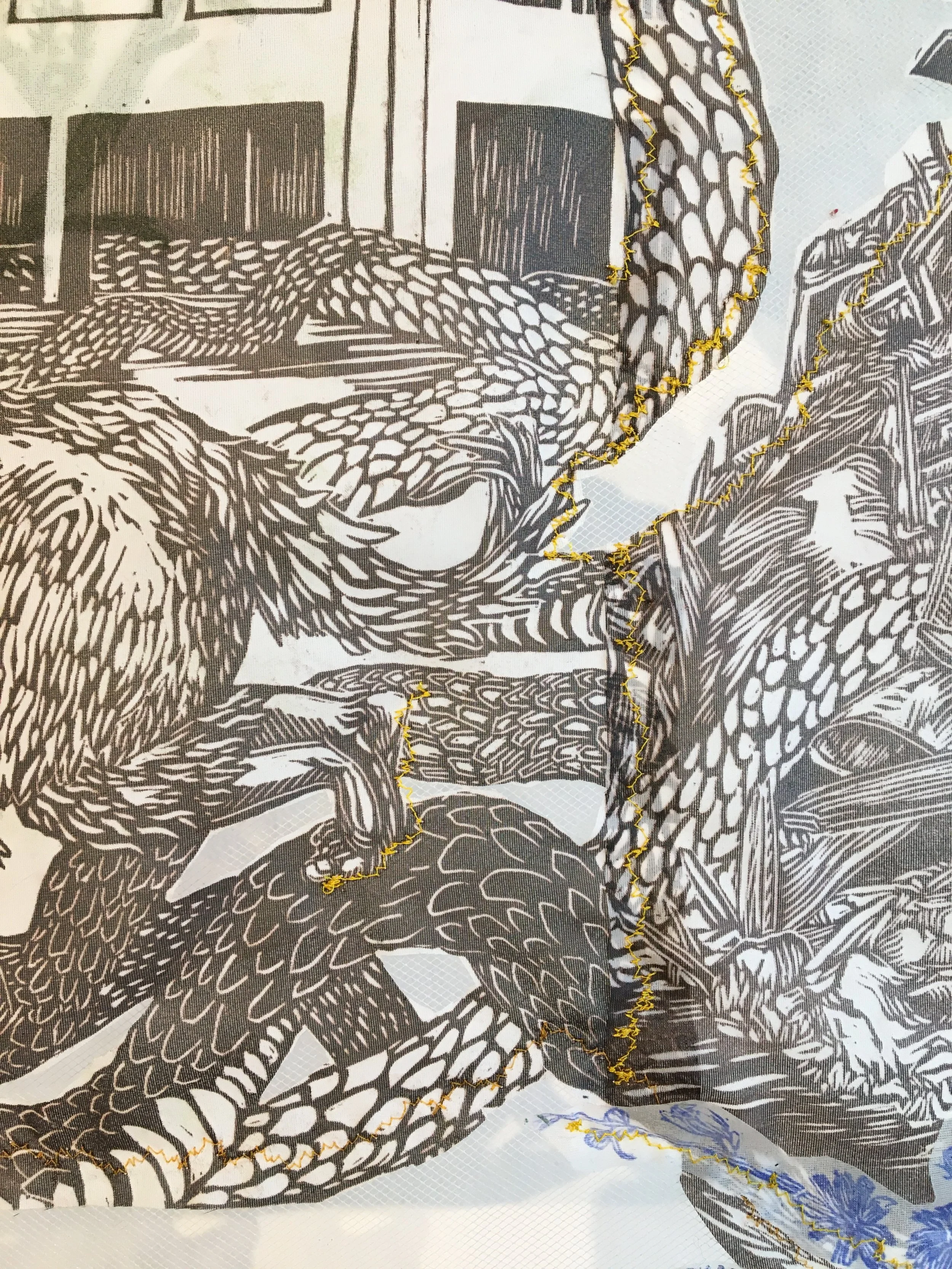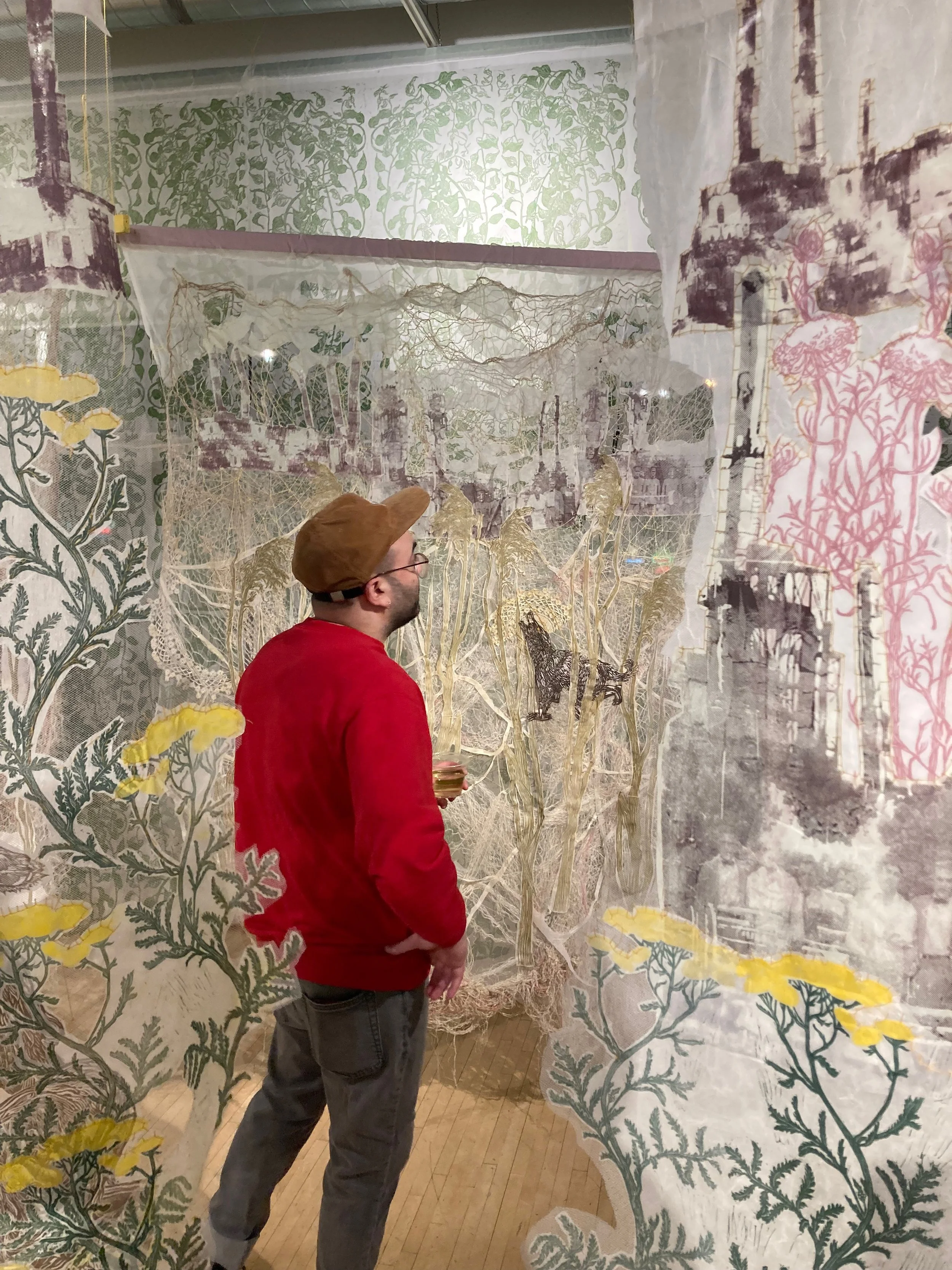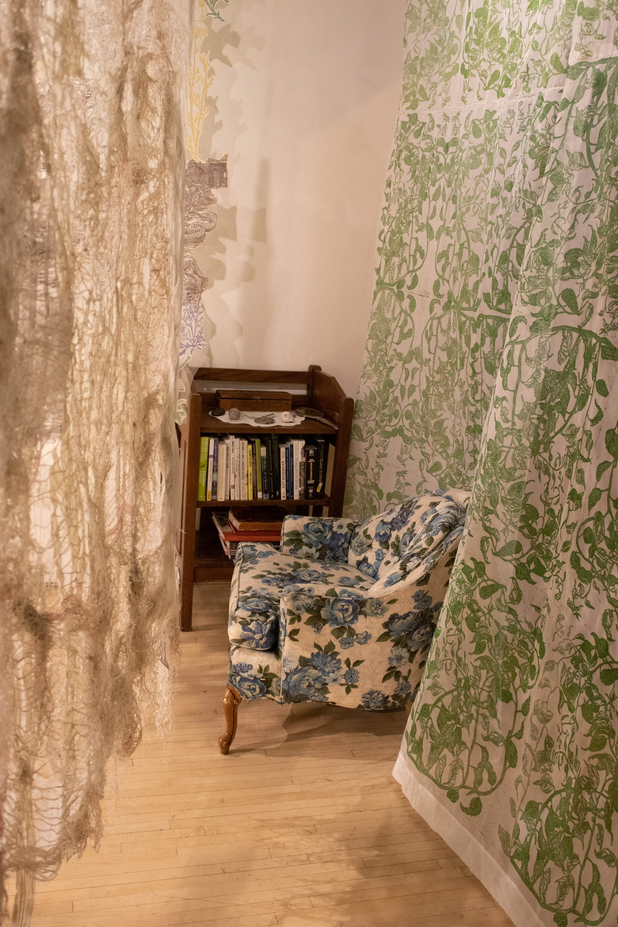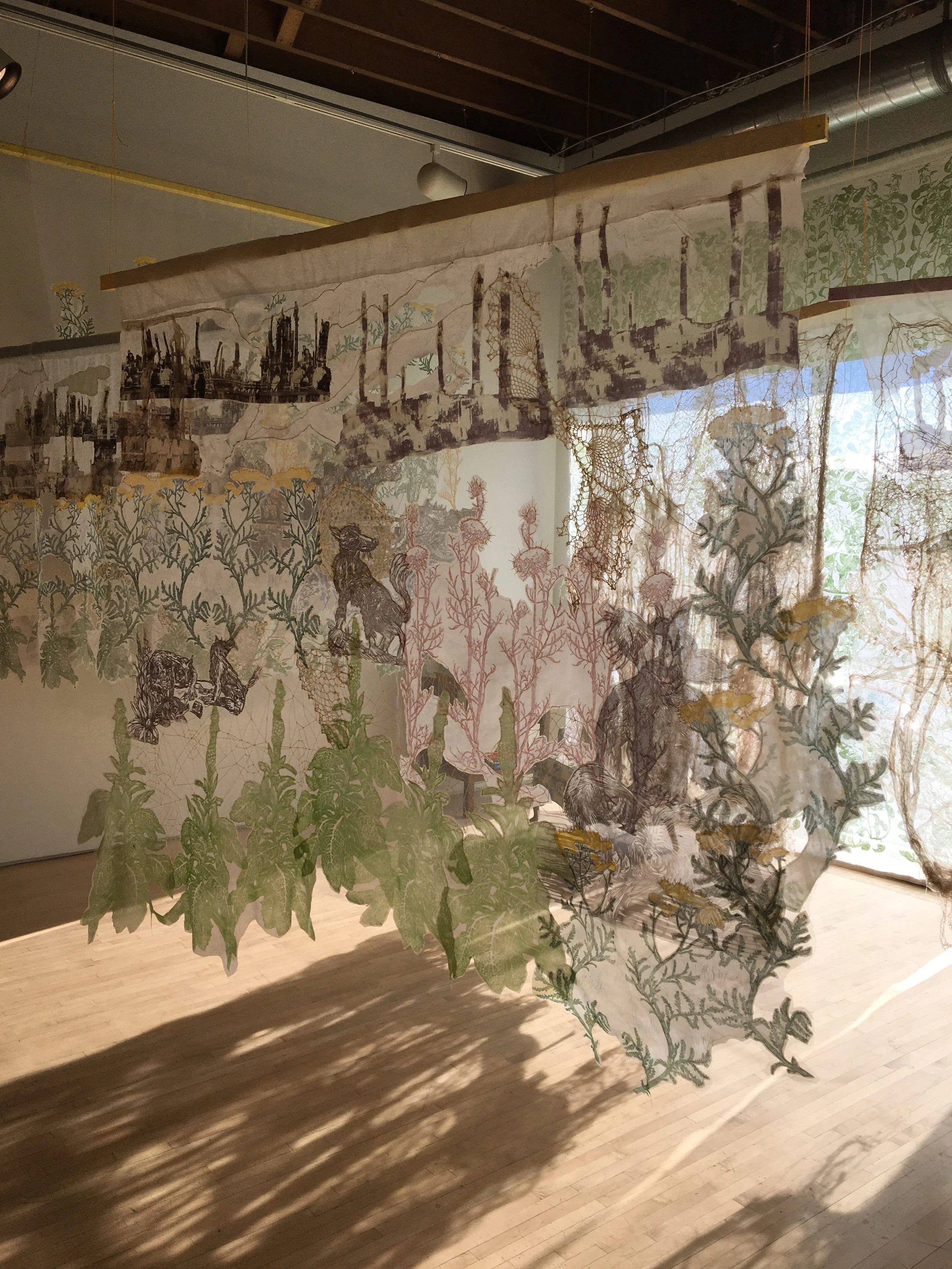 Installation work featuring suspended tapestries of linoleum prints, screen prints, cyanotypes, charcoal and ink drawing on found and salvaged textiles, doilies, plastic agricultural netting, hand and machine stitching. Accompanied by altar with reading corner, 2D prints of cyanotypes with etching, chine colle and ink drawing, and the work of co-fellow Amy Sands. Deepest thanks to the Mcknight Foundation and Highpoint Center for Printmaking for the support. Photos are a mix by Seth Dalseid, Jenny Barlow, and me.