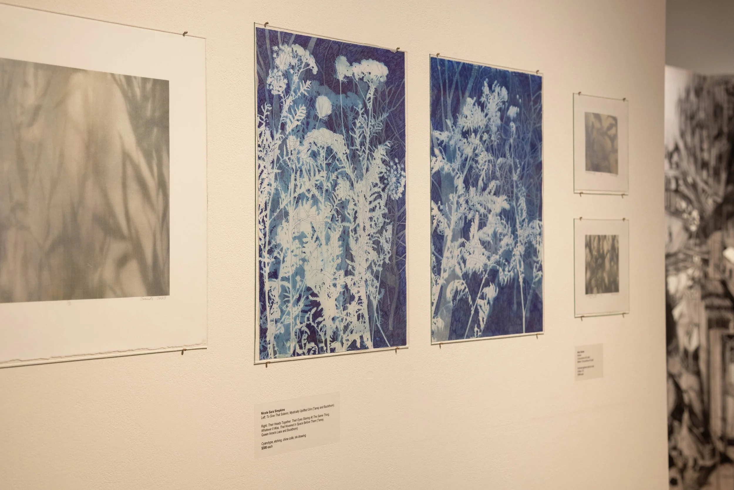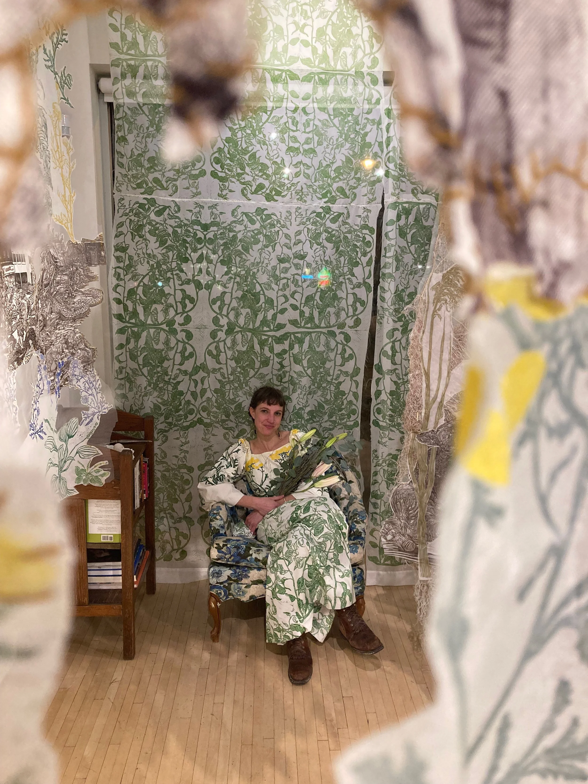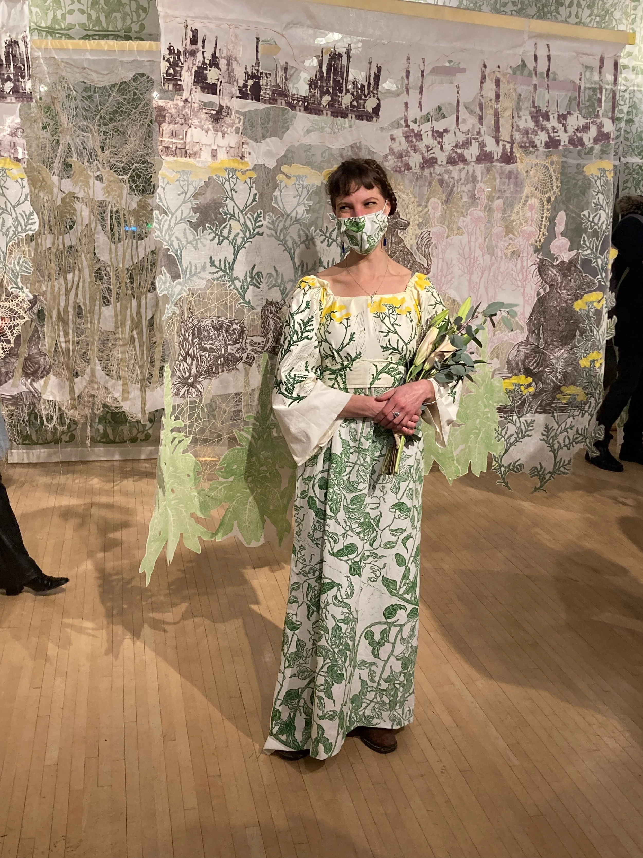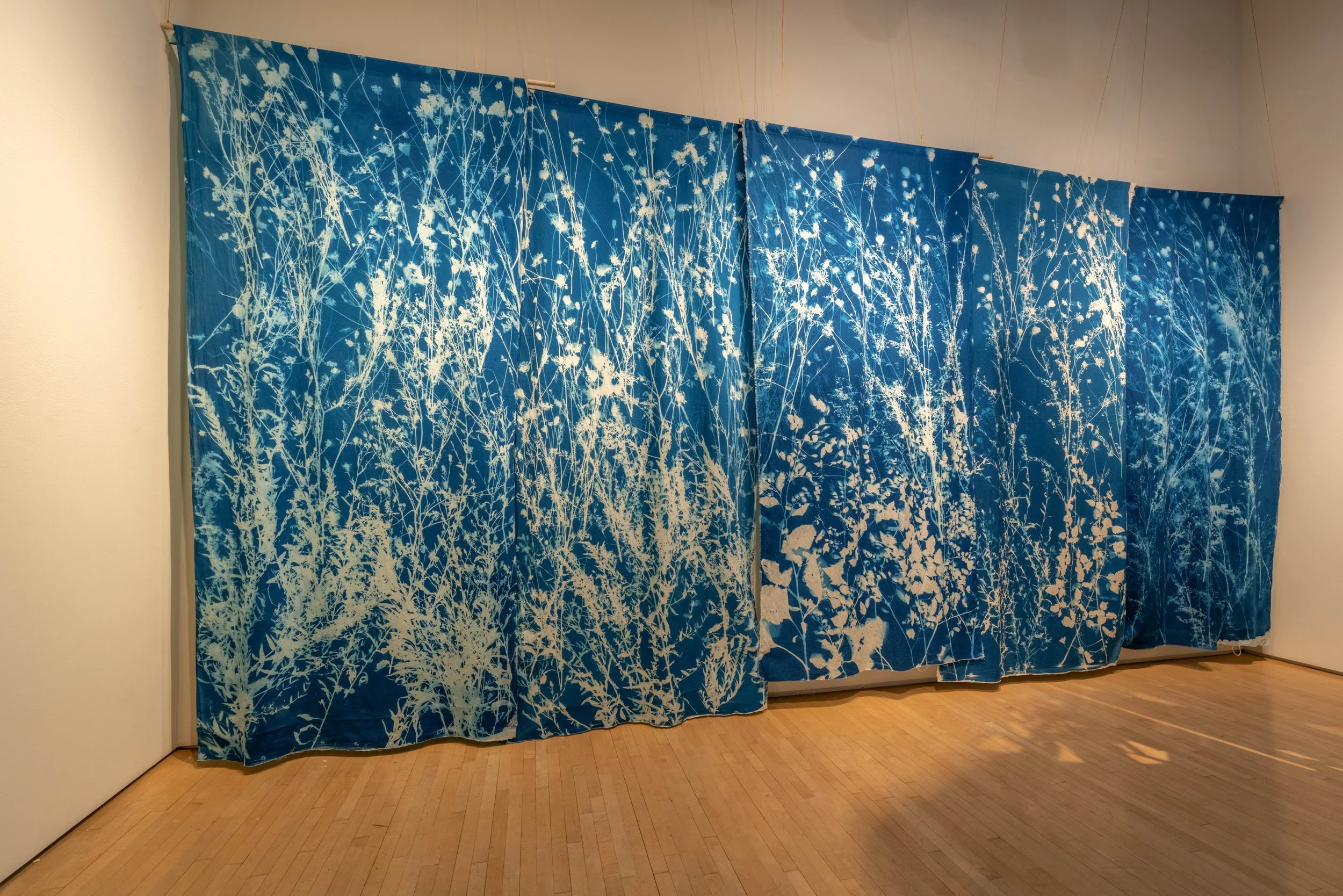 Installation work featuring suspended tapestries of linoleum prints, screen prints, cyanotypes, charcoal and ink drawing on found and salvaged textiles, doilies, plastic agricultural netting, hand and machine stitching. Accompanied by altar with reading corner, 2D prints of cyanotypes with etching, chine colle and ink drawing, and the work of co-fellow Amy Sands. Deepest thanks to the Mcknight Foundation and Highpoint Center for Printmaking for the support. Photos are a mix by Seth Dalseid, Jenny Barlow, and me.