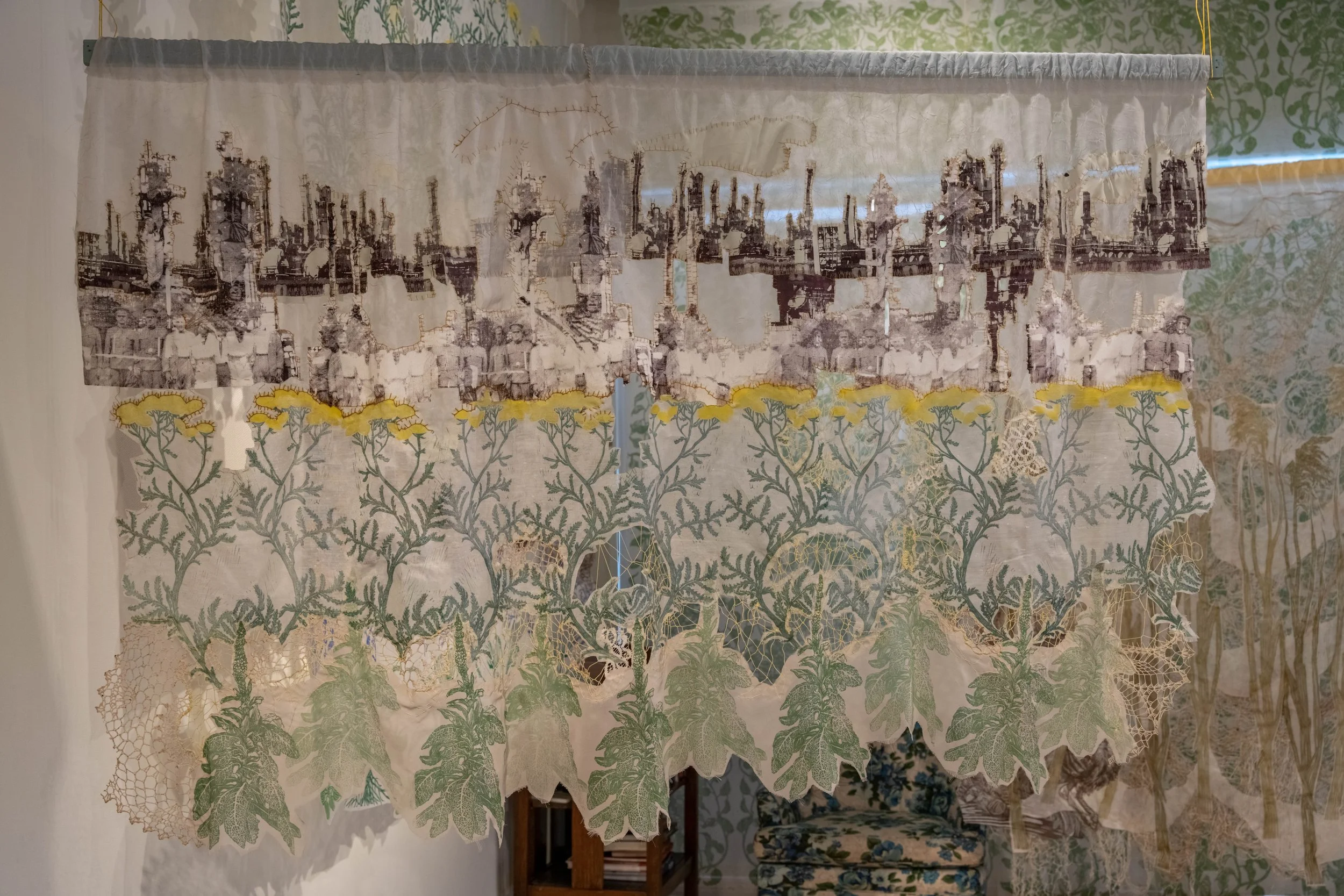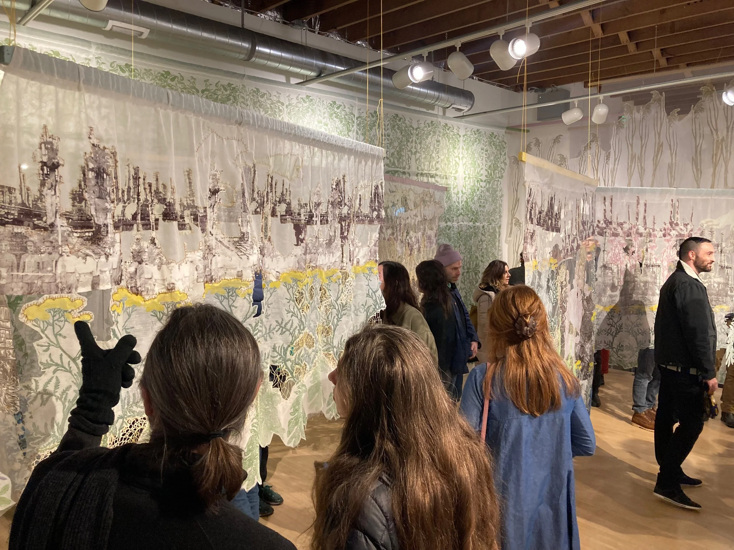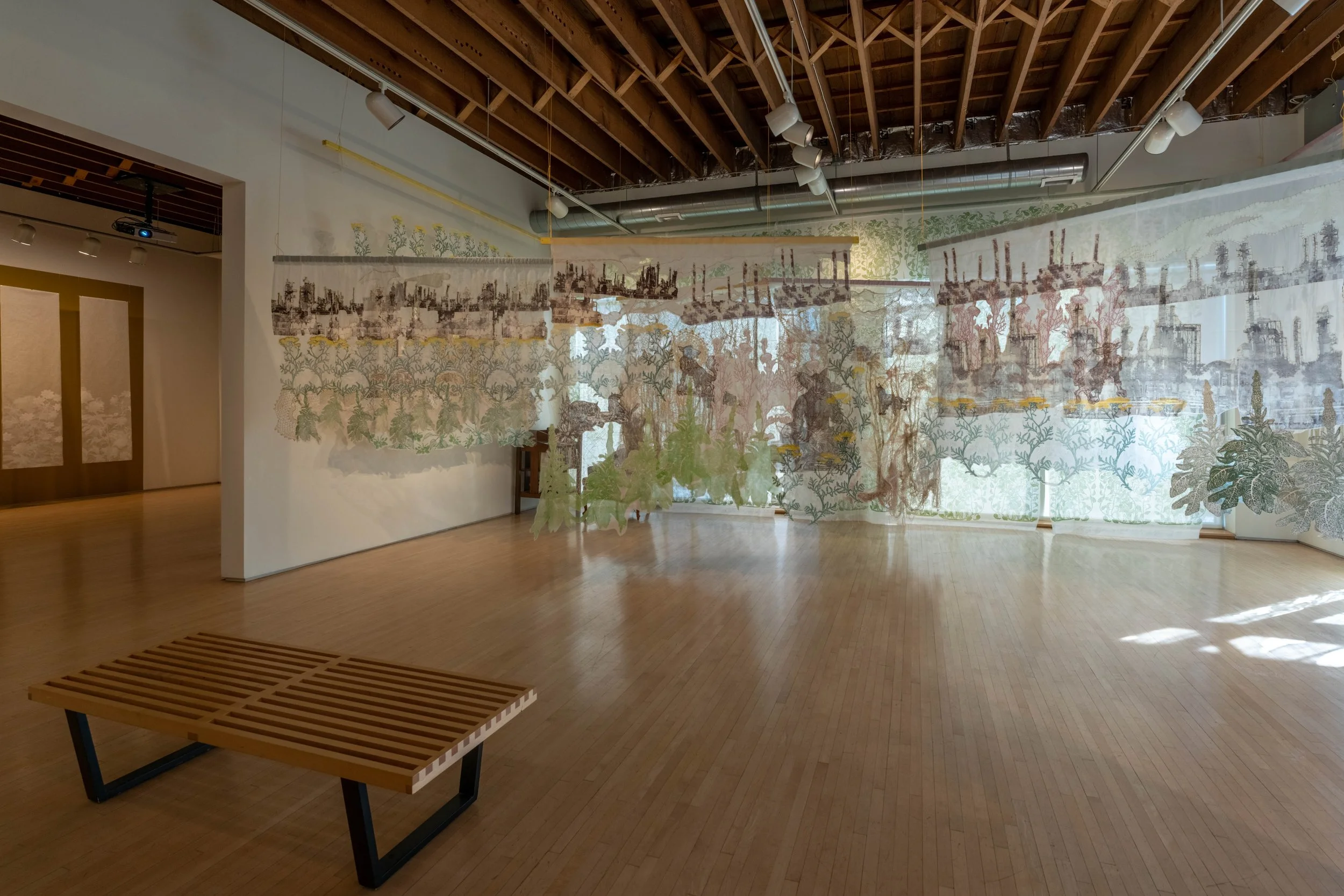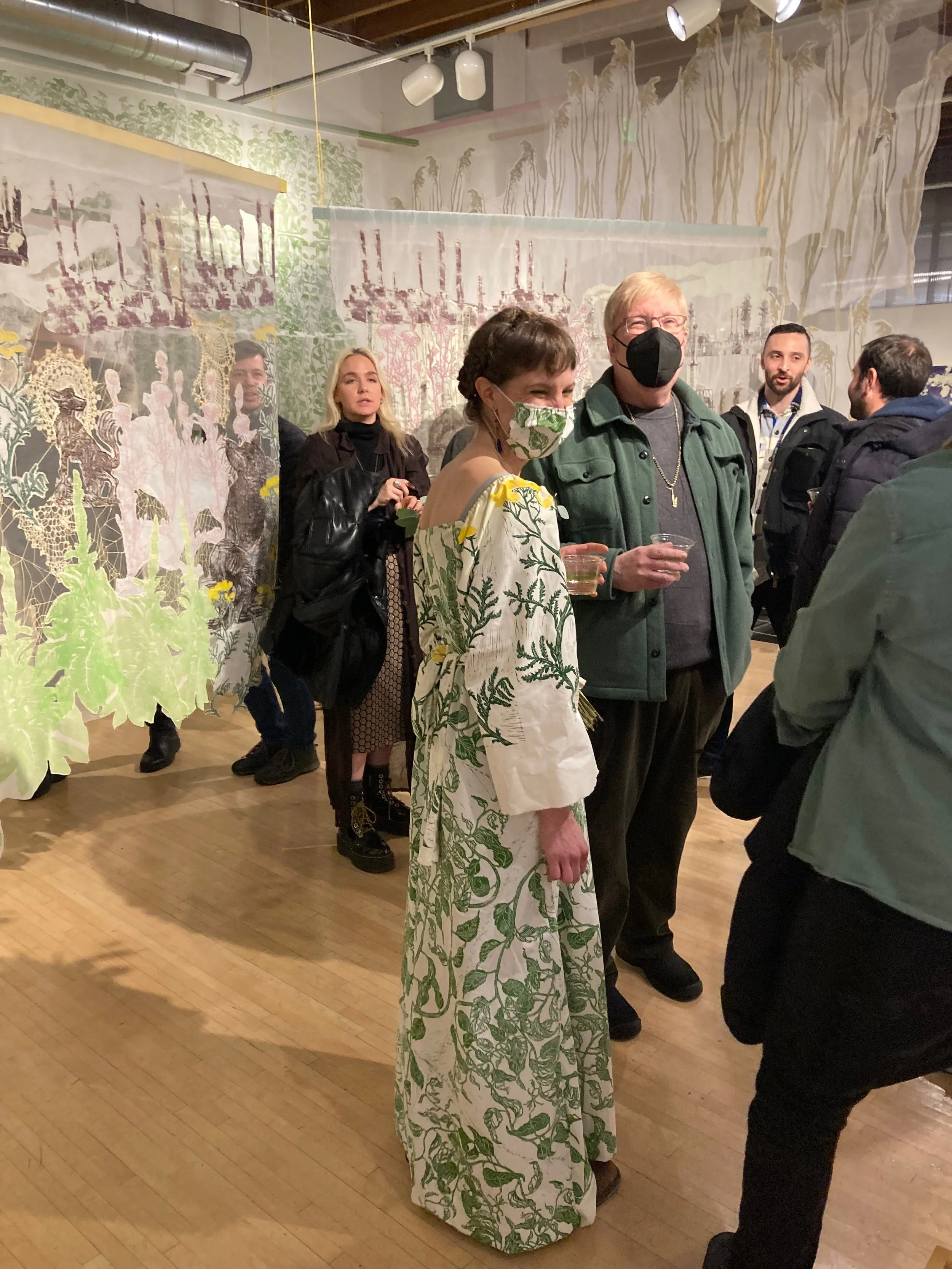 Installation work featuring suspended tapestries of linoleum prints, screen prints, cyanotypes, charcoal and ink drawing on found and salvaged textiles, doilies, plastic agricultural netting, hand and machine stitching. Accompanied by altar with reading corner, 2D prints of cyanotypes with etching, chine colle and ink drawing, and the work of co-fellow Amy Sands. Deepest thanks to the Mcknight Foundation and Highpoint Center for Printmaking for the support. Photos are a mix by Seth Dalseid, Jenny Barlow, and me.