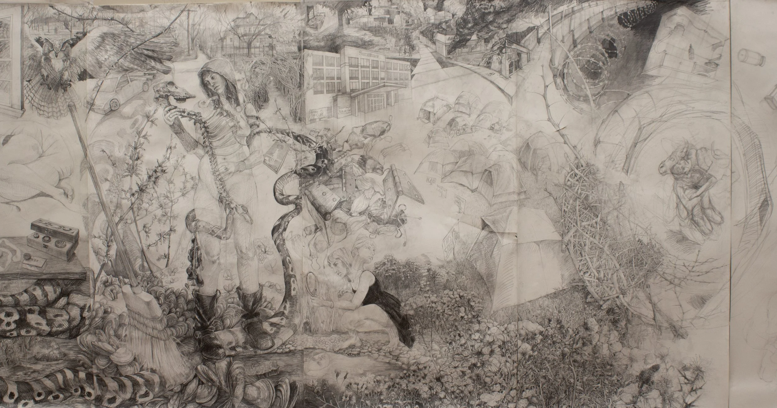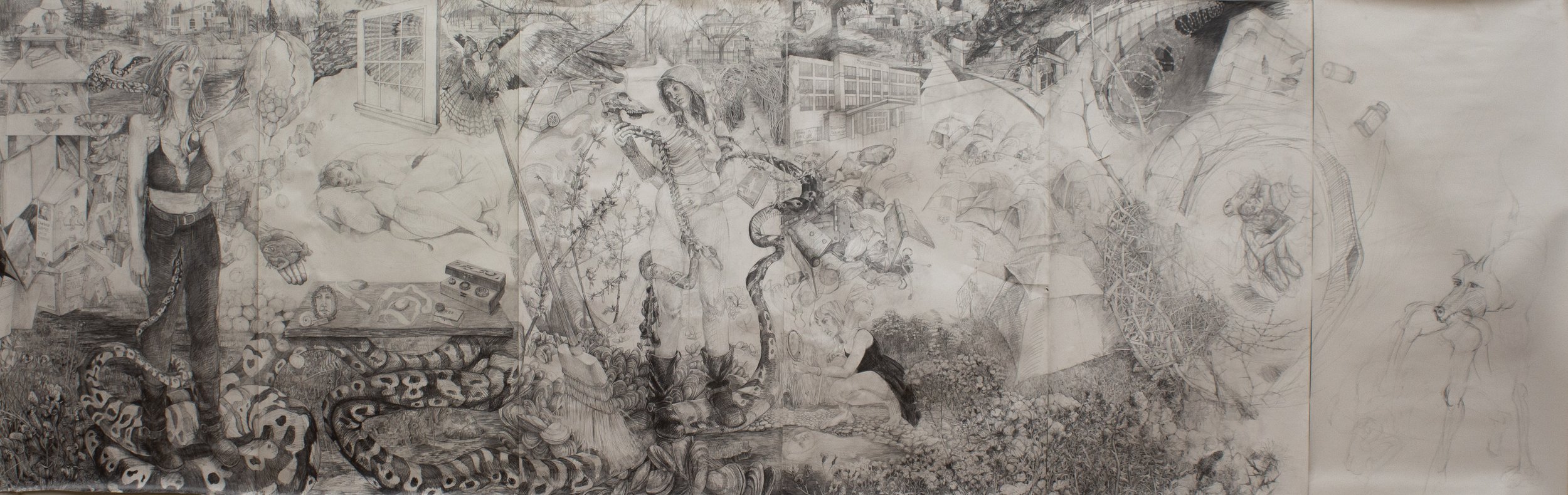 I began this drawing in November of 2019, six months after my mom’s suicide. As time passes, I add panels to the right edge, representing my embodied experience of grief enmeshed with collective moments of upheaval and yearning, symbolic objects, and natural forms. This ongoing drawing is a living documentation of my undoing and reconfiguration - perhaps yours too? These DIY in-progress images mark about 2.5 years into the drawing - I aim to continue working for at least 7.5 more.