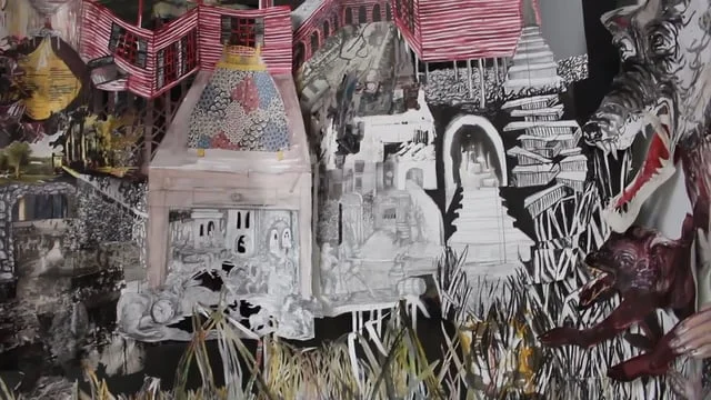 It Never Ends transforms The White Page Gallery into a room-sized pop-up book of mixed-media drawings. You’re invited to enter: come meet monsters, hybrids and hyenas as they couple and disintegrate in a busted world of factories, basements, swamps, and the body of the earth. Find the thread that draws you down past your first glance, follow willingly and find your aches and pains, your sorrows and fears. Notice the crust along your wounds, and wake up your ability to heal.